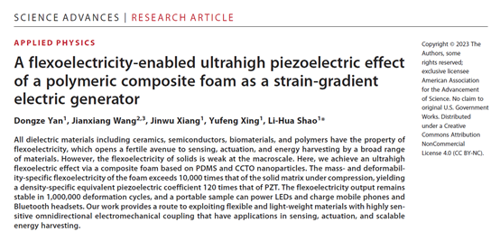近日,我院固体力学研究所邵丽华教授与向锦武院士、邢誉峰教授合作在Science Advances发表了题为 “A flexoelectricity-enabled ultrahigh piezoelectric effect of a polymeric composite foam as a strain-gradient electric generator”的研究论文(http://www.science.org/doi/10.1126/sciadv.adc8845),报道了关于超高挠曲电效应的最新研究成果。
