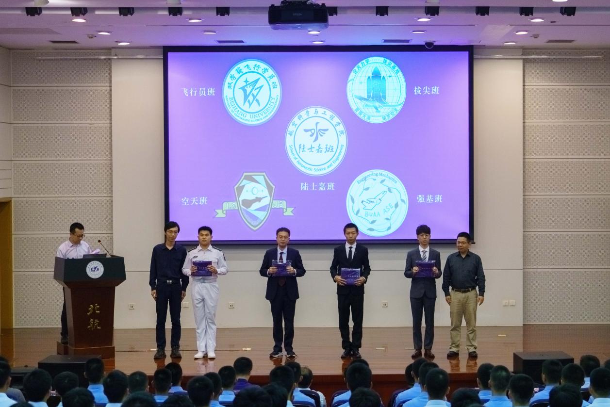 之后,北航学院刘虎院长为黄领才总工程师颁发创新人才培养特区企业导师聘书,学生工作部李广玉副部长为李越洋和陈山教导员颁发军事政治导师聘书。教务部漆明净副部长和沈元荣誉学院孙玉泉副院长分别为飞行员班、拔尖班、强基班、空天班四个特区班级发布班徽并授予班旗。各班班徽与班旗均由同学们自主设计,具有浓厚的航空航天特色。