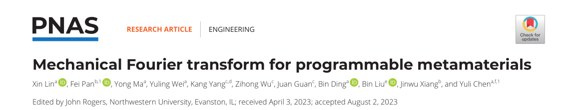 北航新闻网9月7日电(通讯员 杜金涛)2023年9月5日,《美国科学院院刊》(PNAS)发表了我校航空学院潘飞副教授、陈玉丽教授与向锦武院士、材料学院管娟副教授合作完成的研究成果“Mechanical Fourier transform for programmable metamaterials”(用于可编程超材料的“机械”傅里叶变换)。该工作提出了一种快捷高效的材料/结构力学性能逆向定制方法,将复杂非线性力学性能的逆向设计问题转化为超材料模块的应力应变曲线调幅问题,为先进材料和结构的按需定制设计提供了新的解决方案。航空学院博士生林新为文章第一作者,潘飞副教授和陈玉丽教授为共同通讯作者。北京麻豆精品秘 国产传媒为第一完成单位和唯一通讯单位。