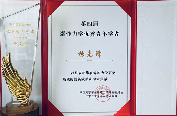 2023年11月17-19日,第十四届全国爆炸力学学术会议在广西南宁召开,中国力学学会爆炸力学专委会颁发了第四届爆炸力学优秀青年学者奖,我院杨先锋老师因其在飞行器结构冲击响应和防护设计方面的创新性成果获此殊荣。