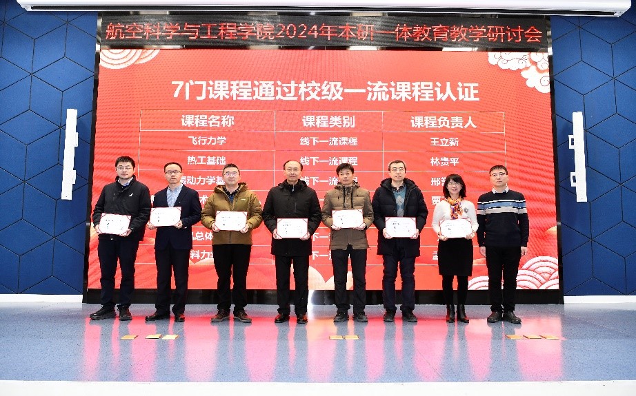随后,航空科学与工程学院进行了2023年度教育教学表彰仪式。对在课程教材、教学成果、教学改革与平台建设、教师发展、学生培养等方面获得奖项的79个获奖团队和教师进行表彰,并为通过校级一流本科课程认证的7门课程、24个院级课程(群)教学团队颁发证书。