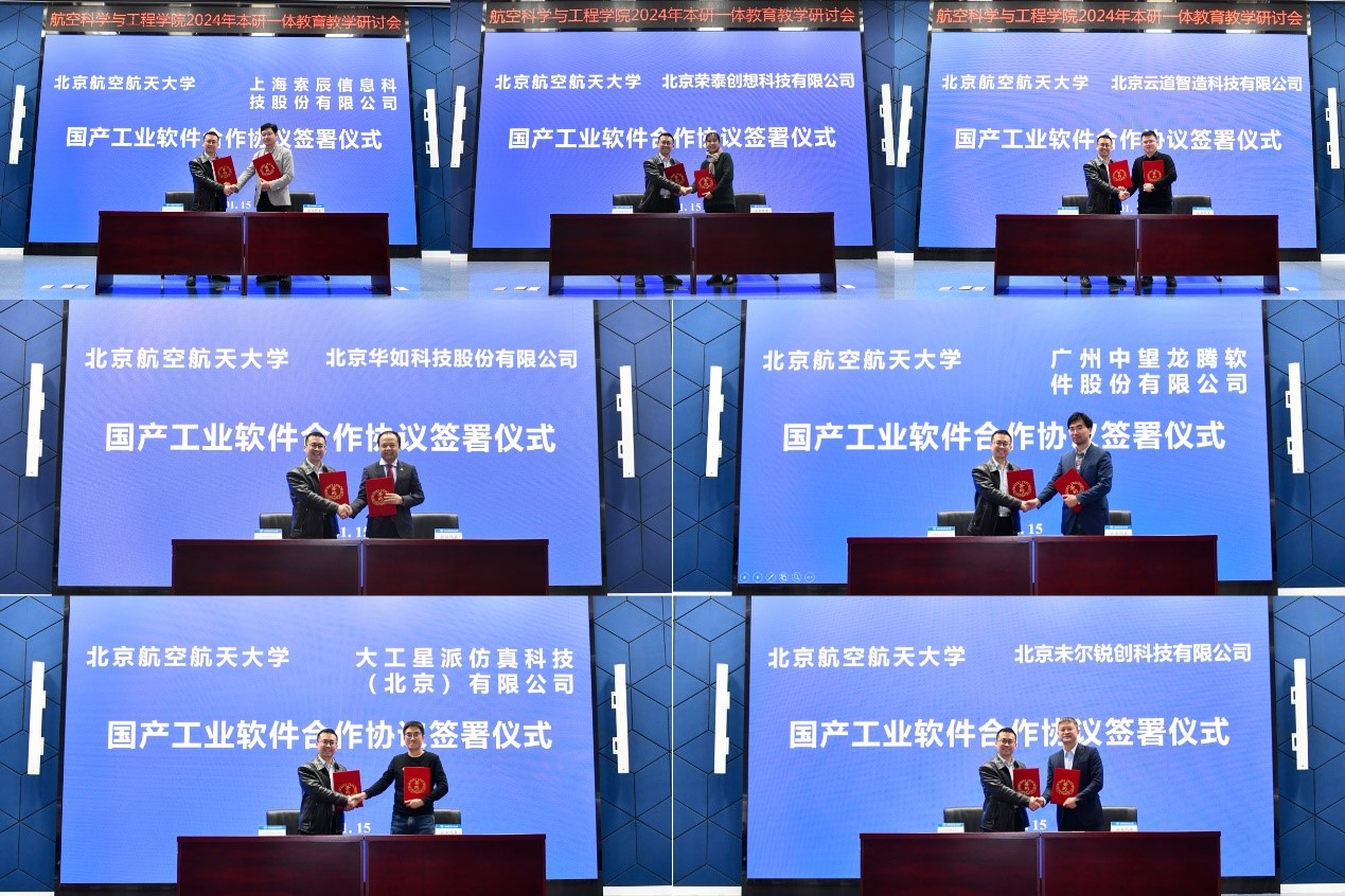 在签约环节,航空学院副院长罗明强与北京荣泰创想科技有限公司等7家企业单位代表签署国产工业软件合作协议,后续将依托“新一代全数字化飞行器科教协同创新中心”开展深度合作。