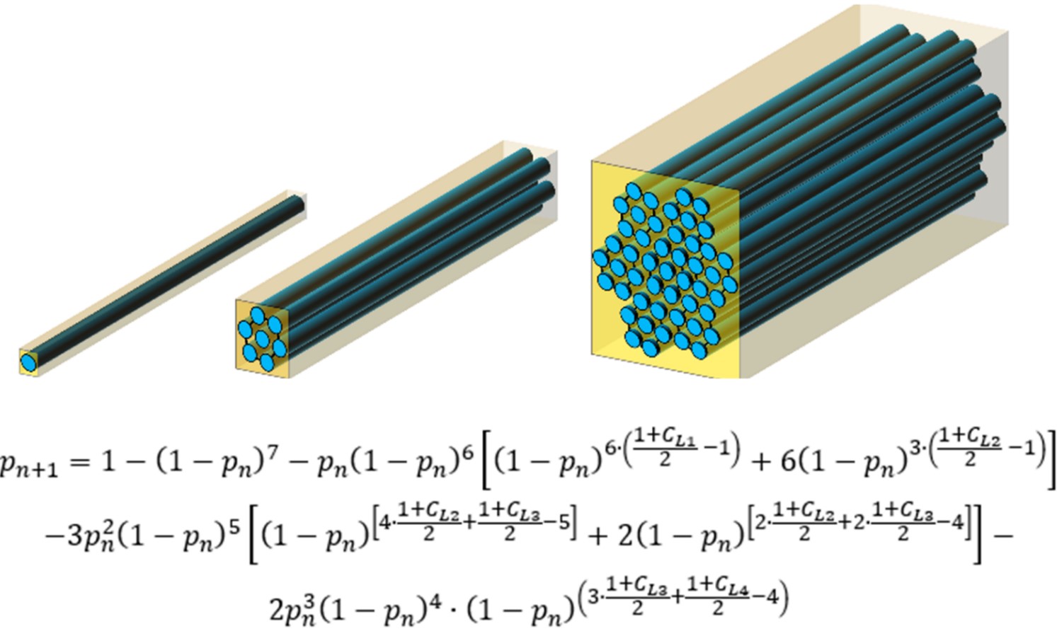 基于重整化群方法建立的强度预测模型具有以下特点:首先,该模型的强度分布是基于六边形分布的纤维束推导而得,与高体积分数复合材料中纤维实际排布的特征相吻合。其次,单根纤维强度随机分布采用了Weibull分布函数进行描述。第三,模型采用了简化的剪滞模型来描述基体剪滞对断裂纤维承载能力的恢复作用。第四,所采用的应力集中系数可基于有限元模型进行标定。此外,该模型还能够提供各尺寸纤维束的强度分布以及在任意应力水平下的纤维断裂簇密度。最后,该模型可以编写为UMAT子程序,用于进行复合材料结构在拉伸强度方面的有限元分析。