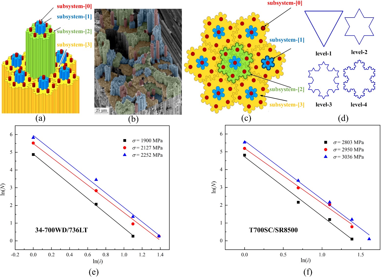 图2. (a)-(d)六边形排布纤维束的准分形断裂面,(e)和(f)复合材料纤维断裂簇尺寸和数目符合幂律关系