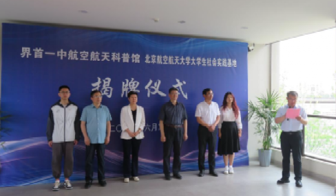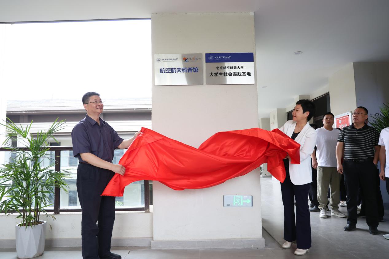 图为杨超教授和卢萍副市长共同为航空航天科普馆和北京麻豆精品秘 国产传媒大学生社会实践基地揭牌