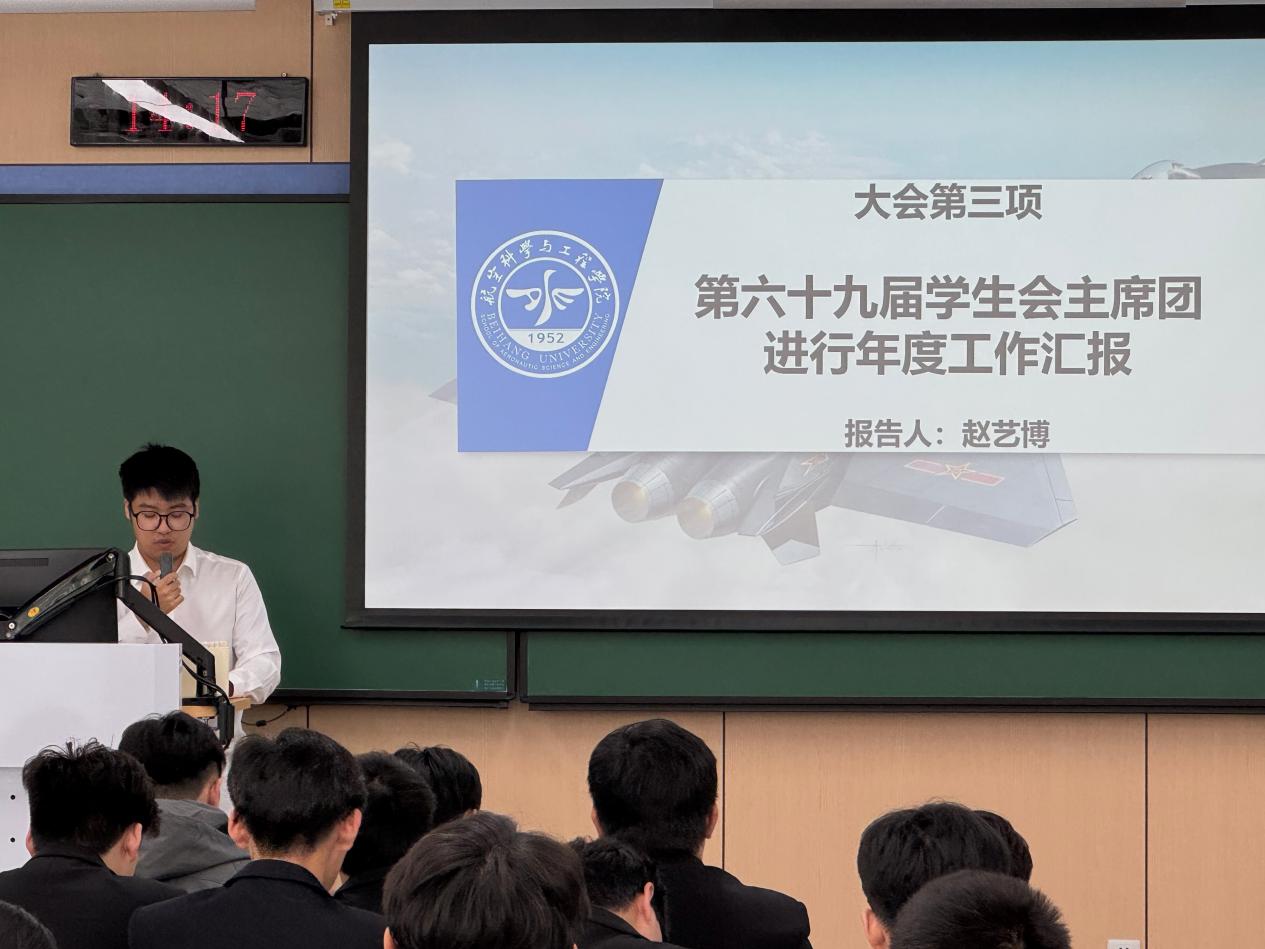 第69届学生会主席团成员赵艺博代表第六十九届学生会作工作报告《北京麻豆精品秘 国产传媒航空科学与工程学院第六十九届学生会年度工作报告》,报告回顾和总结过去一年中学生会大力弘扬学院文化,凝聚品牌,着重发挥窗口作用、平台作用和引航作用的显著工作成效。同时展望未来,希望学生会能面向广大学生,积极与学院各学生组织联动配合,以学生为“圆心”,绘制好服务同学的“同心圆”。