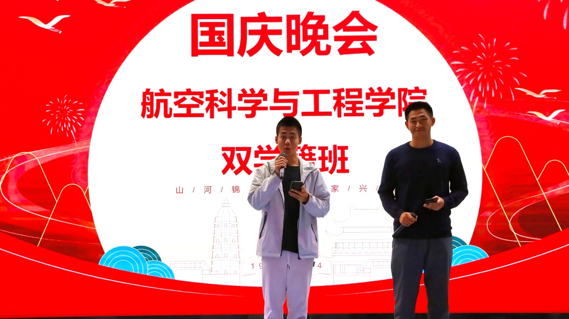 (通讯员 王鹏,赵景琛)2024年10月1日晚,为庆祝中华人民共和国成立75周年,航空科学与工程学院双学籍班在北航沙河校区主楼A座415精心筹备和组织了一场国庆晚会。晚会上,同志们争先参与,用舍我其谁的气魄、别具一格的创意、和以美润心的展演弘扬爱国精神,表达对祖国山河锦绣、繁荣兴盛的诚挚祝福。
