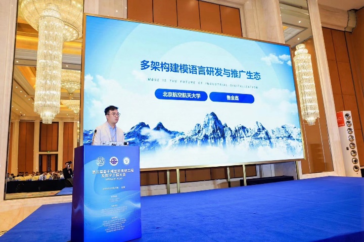 大会专家论坛,分别由中国商飞北研中心需求工程部部长唐剑、中国系统工程学会副秘书长郑新华主持。航空工业机载共性中心集团首席技术专家田莉蓉、航天五院副总师王为、中国核动力研究设计院数字化项目副总师李松蔚、中国航发四川燃气涡轮研究院主任祁宏斌、航天十二院首席信息官侯俊杰、中国航空综合技术研究所副总师宋涛、航天八院副总师阮开智等来自航空、航天、航发和核工业等十余位专家,分别做了大会报告,分享了在基于模型的系统工程(MBSE)在中国深入发展的大趋势下,关于基于模型的系统工程和数字工程方面的技术思考和应用实践。其中,我院鲁金直副教授作《多架构建模语言研发与推广生态》为名的大会主题报告。报告中介绍了多架构建模语言KARMA的发展历程及生态推广与应用情况。相关专家报告引起了与会者高度关注和热烈讨论。