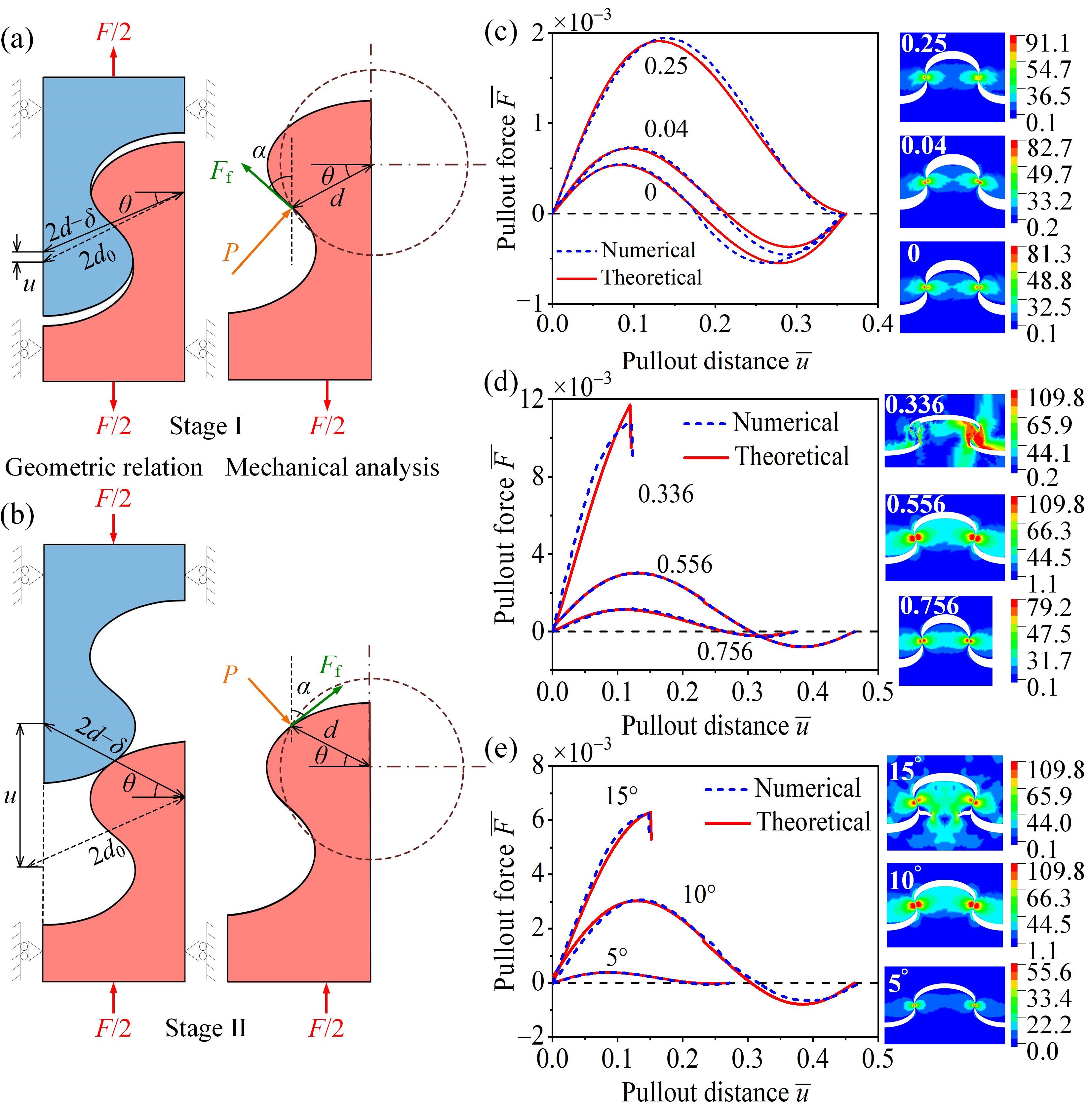 如图2a和2b所示,赵子龙等基于连续介质力学和接触力学建立了椭圆骨缝的拉拔力学理论模型。如图2c—2e所示,该模型可以精确预测出不同骨缝结构的变形和失效行为;理论预测的结果得到了有限元模拟和实验的验证。他们探讨了骨缝的纵横比、联锁角和界面摩擦等因素对结构承载能力、变形能力和失效机理的影响,揭示了其结构—性质之间的内在联系。