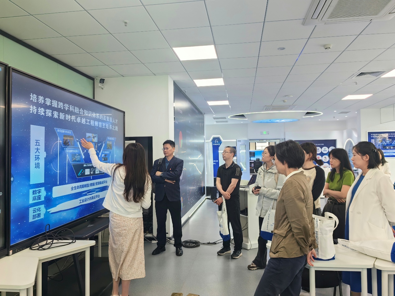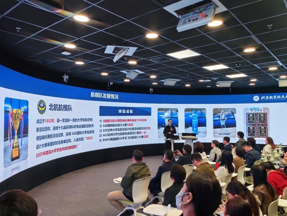 在教学资源展示环节,与会人员参观了北航全景教室,沉浸式感受航空科技的无穷魅力。李可教授展示了虚拟仿真课程及其在航空航天教学中的创新应用,通过沉浸式体验,让学生更好地理解和掌握相关知识和技能。宋磊老师介绍了北航航模队的发展历程和辉煌成就,分享了航模队的课程体系与技术特点,强调其在培养学生航空航天兴趣和实践能力方面的重要作用。