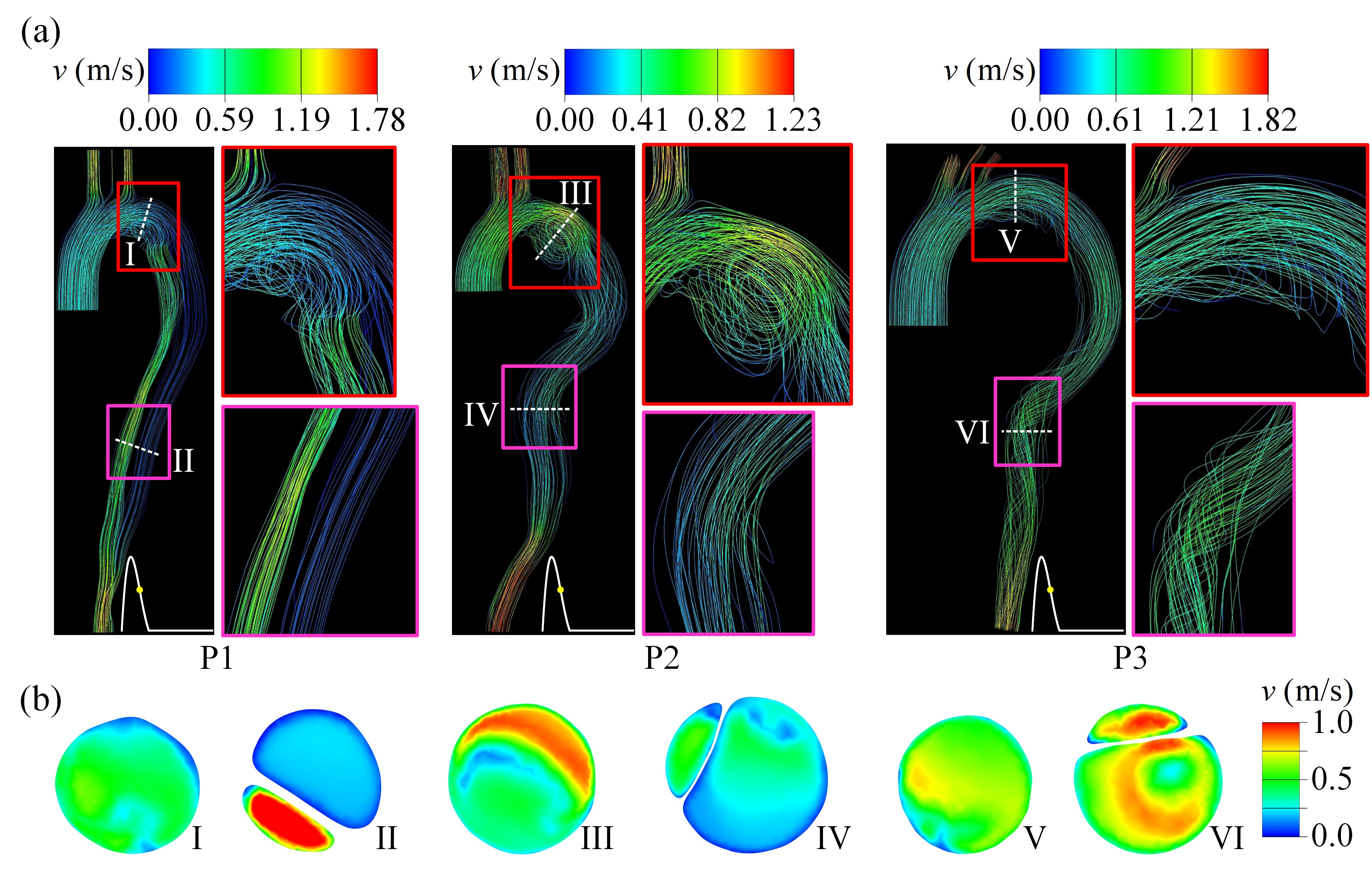 图4. 心脏收缩中期的血流速度。(a)流线图;(b)典型横截面的血流速度分布。
