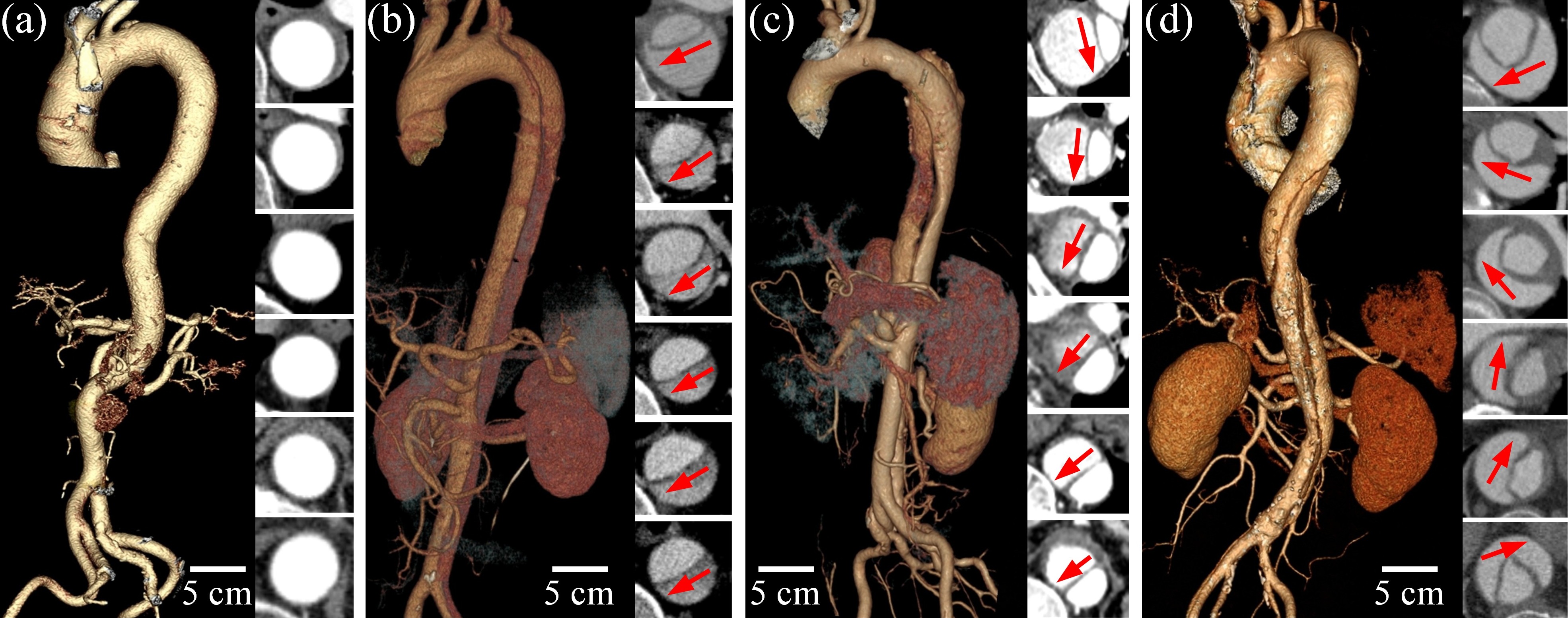 图2. 主动脉所呈现出的不同程度的螺旋手性形貌。(a)正常主动脉;(b)弱手性;(b)中手性;(c)强手性。