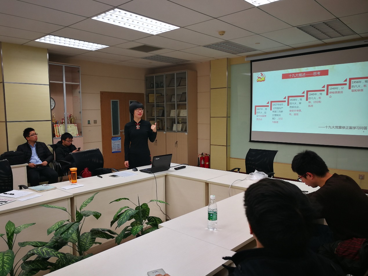 2017年12月29日,航空科学与工程学院2015级硕士生第一、二、三党支部在新主楼C708会议室联合举办了“学习贯彻党的十九大精神”宣讲会,会上再次邀请了来自北京高校博士生宣讲团、学习贯彻十九大精神北航研究生宣讲团的王雪晴宣讲员,她为三个支部的60余名党员作了主题为“思想引领,筑梦青春——习近平新时代中国特色社会主义思想解读”的宣讲。
