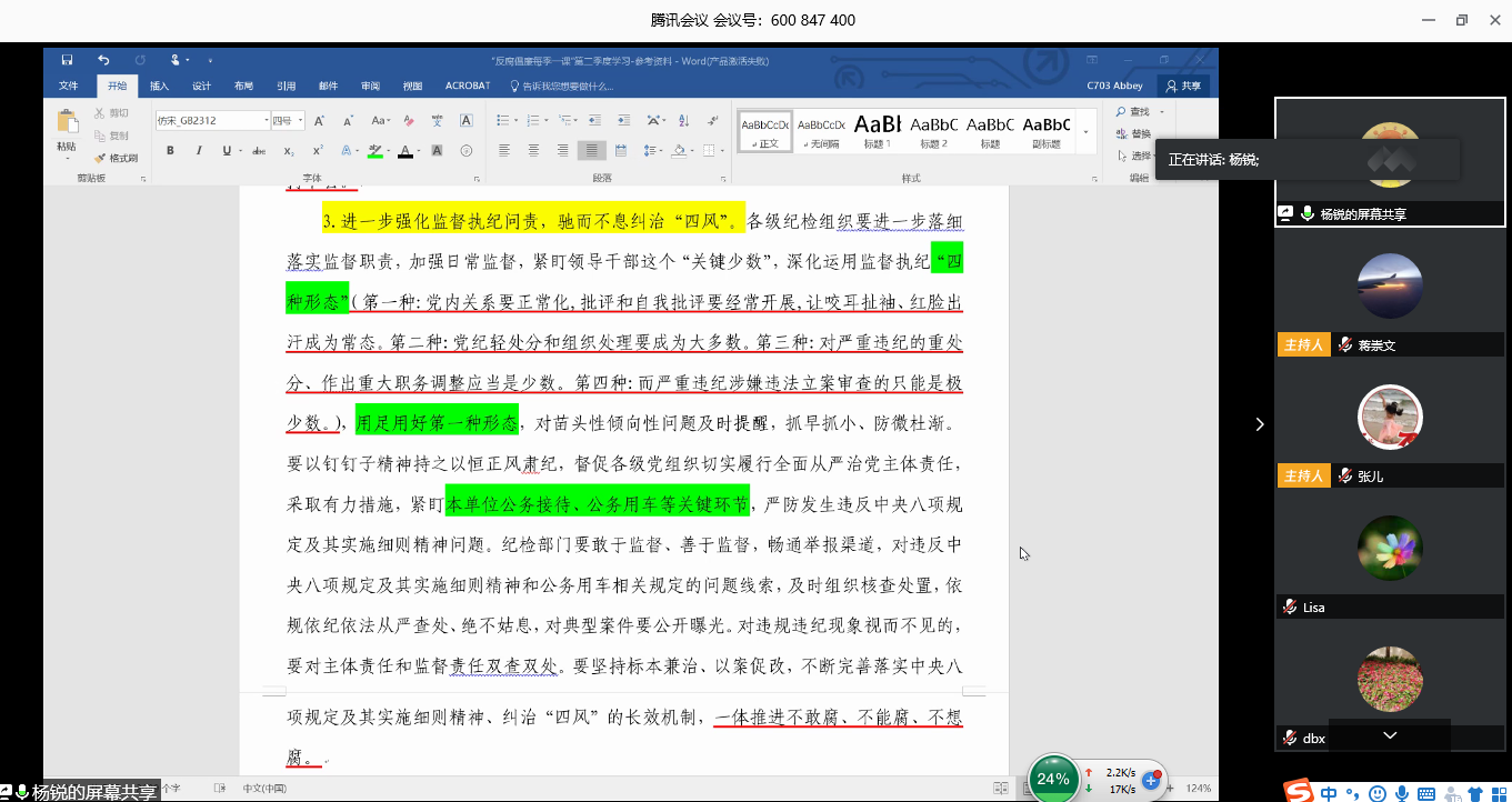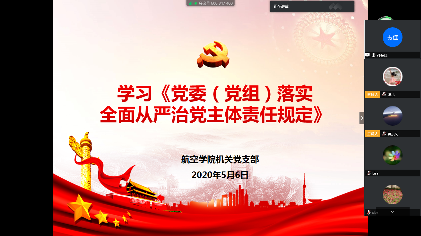 (通讯员 张娟)5月6日,航空学院机关教职工在线开展反腐倡廉主题“学习日”活动,机关全体20名教职工集体学习了《党委(党组)落实全面从严治党主体责任规定》精神及《违反相关规定典型案例的通报》。