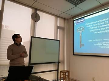 刘强博士的报告从孔边应力集中问题出发,基于遗传算法和有限元方法提出一种新的数值模拟方法,可以实现纳米复合材料中碳纳米管的空间分布优化,达到减小孔边应力集中系数的目的。他通过虚拟实验证实,优化后的碳纳米管网络可以延迟纳米复合材料损伤的萌生,并进一步抑制损伤的扩散,并通过碳纳米管的拔出实现材料的增韧。这种方法为基于网络材料的新型复合材料的优化设计提供了新的方法和思路。报告结束后,北航师生与刘强博士就基于遗传算法的多尺度优化中的细节问题进行了深入讨论交流,并对该方法的应用前景以及后续的实验验证进行了热烈的讨论。