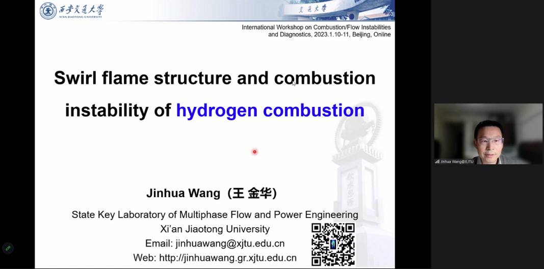 中国西安交通大学王金华教授以《Swirl flame structure and combustion instability of hydrogen combustion》为主题,对氢气燃烧中的旋流火焰结构与燃烧不稳定性问题的研究进行了报告。