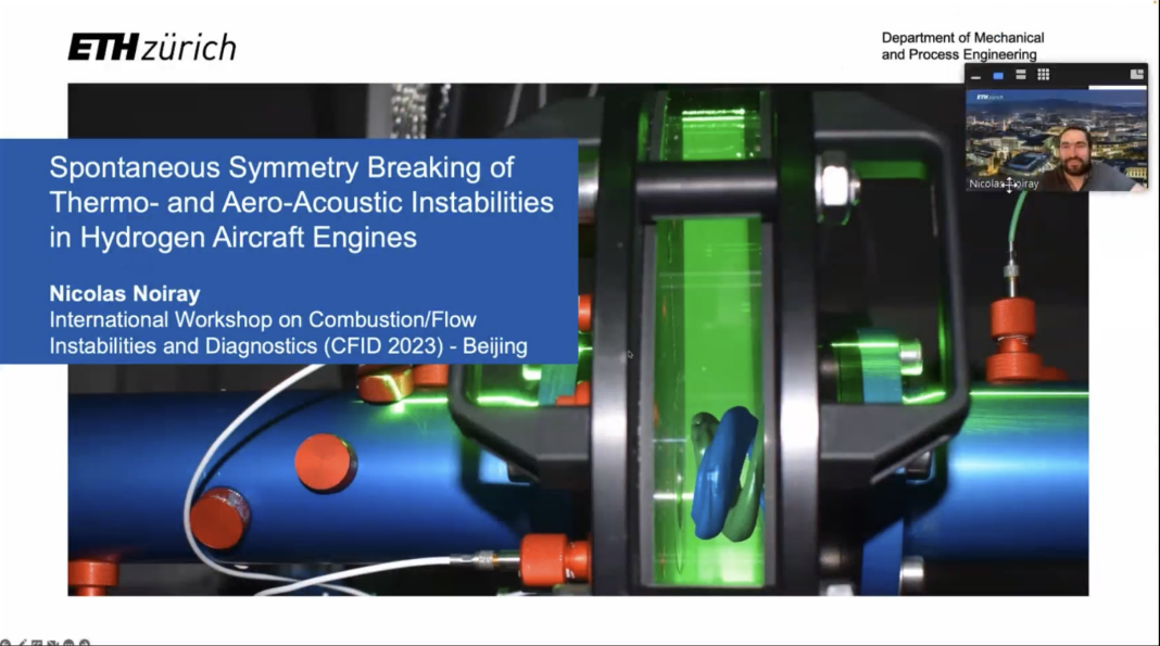 瑞士苏黎世联邦理工学院的Nicolas Noiray教授以《Spontaneous symmetry breaking of thermo- and aero-acoustic instabilities in hydrogen aircraft engines》为主题,对燃气轮机燃烧室采用氢气为燃料时不稳定性自发性对称破缺问题进行了报告。