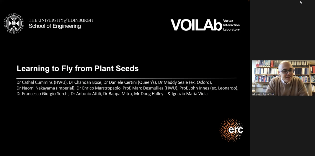 英国爱丁堡大学Ignazio Maria Viola 教授以《Unsteady Aerodynamics of the Dandelion》为主题,对蒲公英飞行中的不稳定性空气动力学问题进行了报告并结束了研讨会第二天的报告日程。