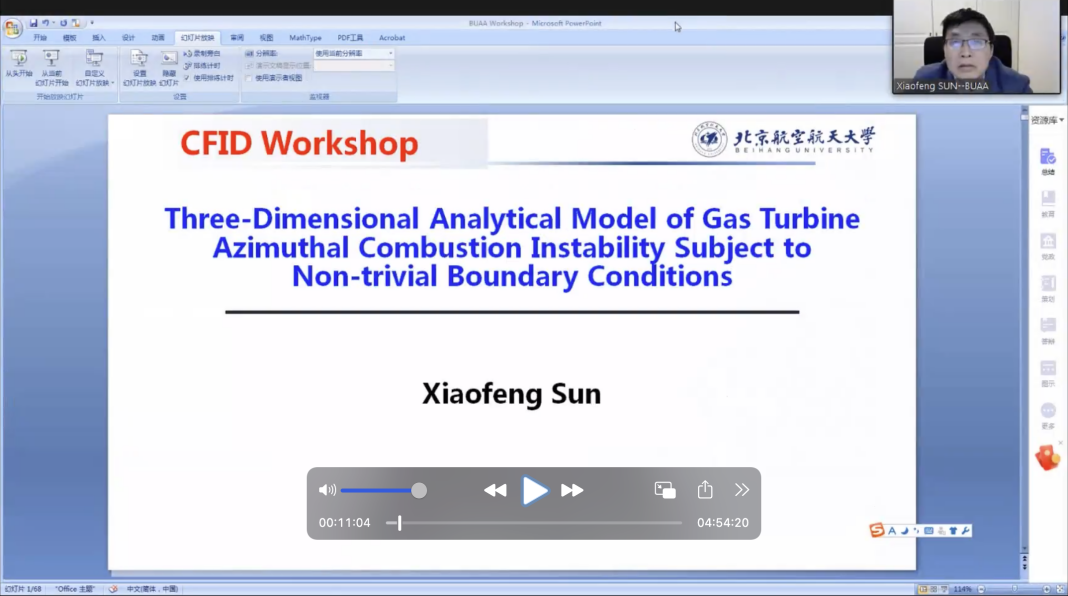 中国北京麻豆精品秘 国产传媒的孙晓峰教授以《Three-dimensional analytical model of gas turbine azimuthal combustion instability subject to non-trivial boundary conditions》为主题,围绕燃气轮机与航空发动机中的热声不稳定性的三维解析解模型问题,进行了本次研讨会的第一个报告。