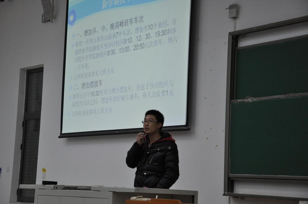 航空学院2010级全体同学于2012年2月19日晚20:30在北航沙河校区J0-001教室举行新学期首次大班会。本次会议由辅导员郭祖博和冀赵杰主持,会议旨在总结上学期期末成绩,动员同学们及时调整状态,从而以更加饱满的热情投入到新学期的学习生活和工作中去。