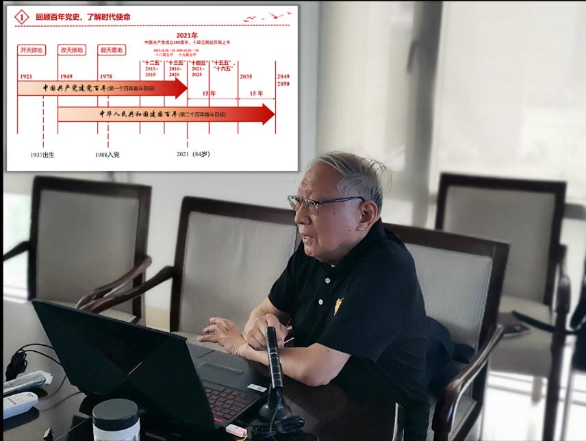 党课内容分为两部分,第一部分是“回顾百年党史,了解时代使命”。徐扬禾老师从党的十九届五中全会和十四五规划出发,讲述了新发展阶段在我国发展进程中的重要意义,他用一幅清晰的时间表概括了中国共产党的奋斗历程,结合自己的人生经历娓娓道来,时代的恢弘感和强烈的历史感使同学们颇受震撼。