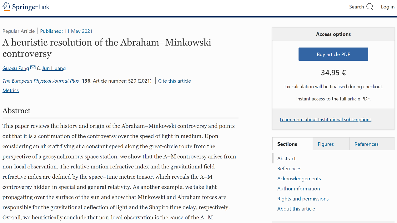 近日,我院冯国旭博士后和黄俊教授用非常规方法解决了亚伯拉罕-闵可夫斯基百年争议,成果发表在European Physical Journal Plus期刊(Q1,影响因子3.228)。论文的研究方法源自于飞机的大圆导航方程和军用飞行器对雷达隐身突防效能仿真建模中采用的电磁波传播理论。