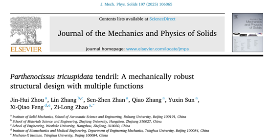 近日,我院赵子龙教授及其合作者在固体力学国际顶级期刊《Journal of the Mechanics and Physics of Solids》发表论文《Parthenocissus tricuspidata tendril: A mechanically robust structural design with multiple functions》,揭示爬山虎卷须几何形貌与力学性质之间的内在联系,发现渐窄的吸盘分布与曲折的主轴构型使卷须具备了综合优异的力学性质——爬山虎卷须在获得高稳健性、承载能力、材料使用效率的同时,还表现出对缺陷的不敏感性。这项工作加深了对相关自然现象的理解,在高性能悬索系统的仿生设计等方面有潜在的应用价值;更重要的是,这项研究激发人们从新的角度思考自然造物的规律与要义。