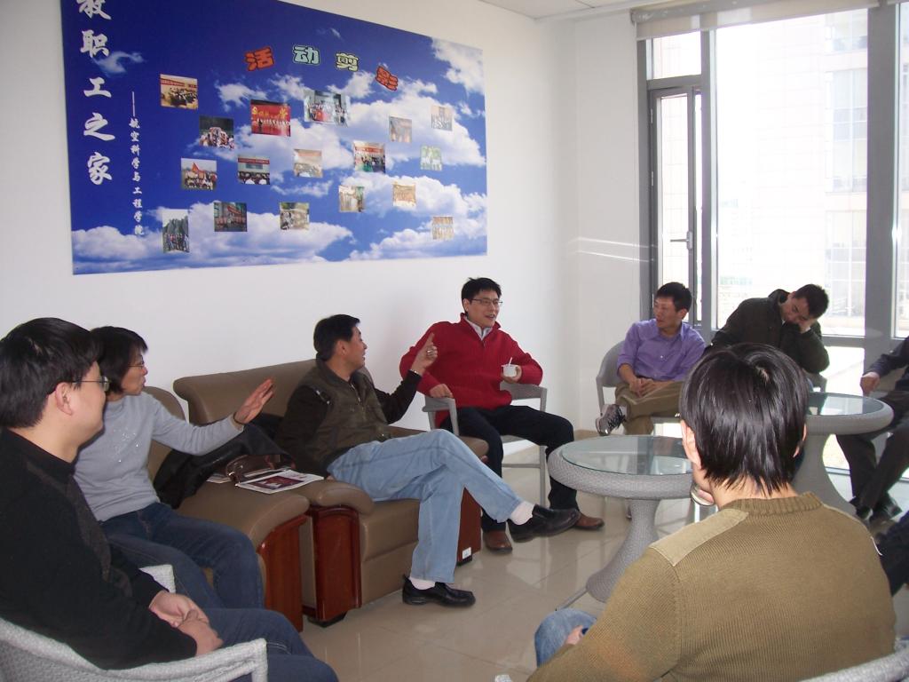 2012年3月14日中午,航空科学与工程学院组织教师羽毛球爱好者在新主楼C座830教师发展中心进行一次惬意的座谈会。主题是:球与人生。大家就初级爱好者如何训练,羽毛球的战略战术,羽毛球名将的故事等谈及人生、工作的发展。
